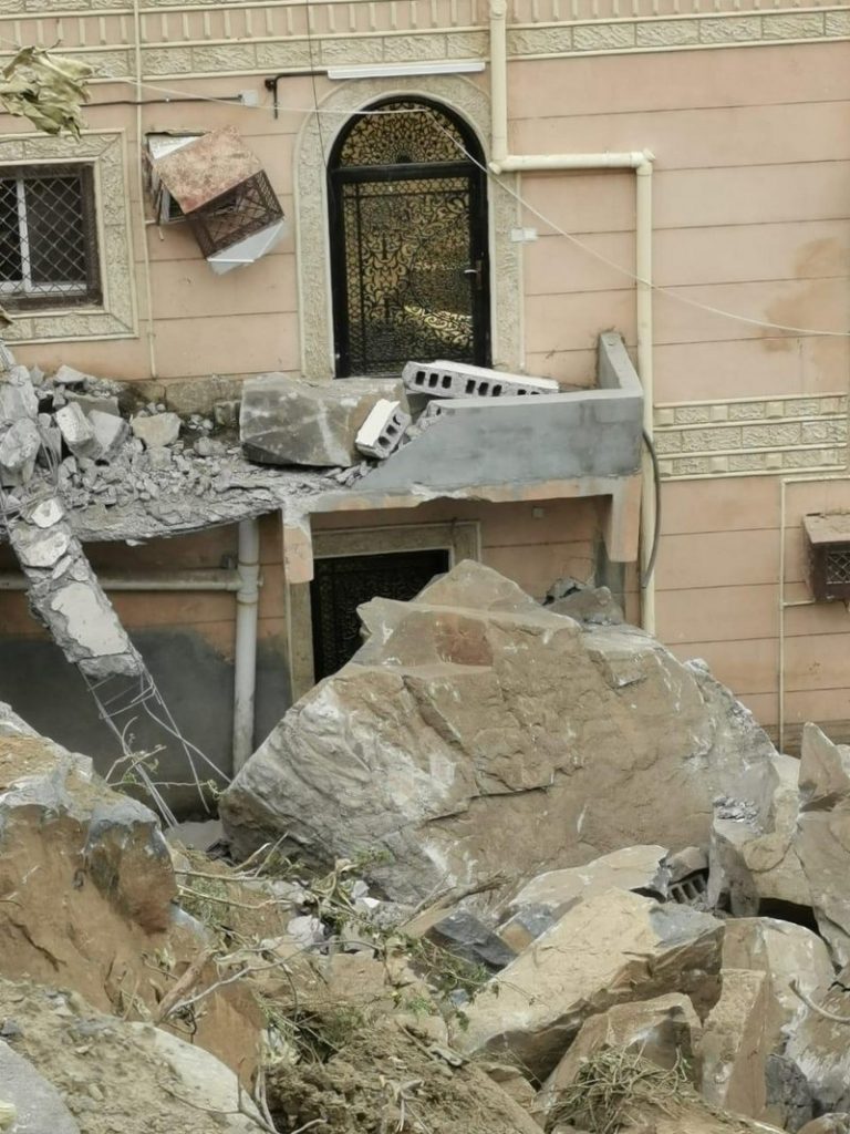 أدى انهيار صخري ضخم في إحداث أضرار جسيمة بمنزل مواطن في محافظة فيفاء شرقي منطقة جازان نتيجة للأمطار الغزيرة التي ضربت المنطقة.