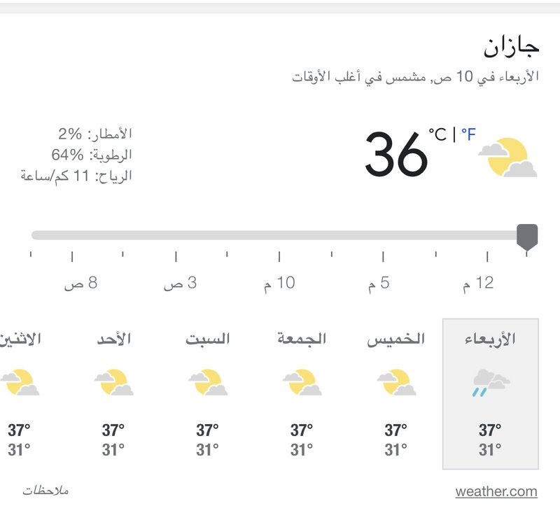 وكانت منطقة جازان قد سجلت اليوم درجة حرارة عظمى وصلت إلى 37 درجة مئوية، فيما من المتوقع أن تسجل درجة الحرارة الصغرى 31.