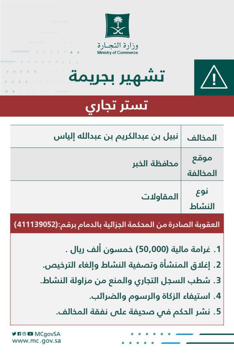 ونشرت الوزارة الحكم القضائي الصادر من المحكمة الجزائية بالدمام والمتضمن تغريم المتستر 50 ألف ريال وإغلاق المنشأة وتصفية النشاط وإلغاء الترخيص وشطب السجل التجاري والمنع من مزاولة النشاط، واستيفاء الزكاة والرسوم والضرائب، والتشهير عبر نشر الحكم في صحيفة على نفقة المخالف.