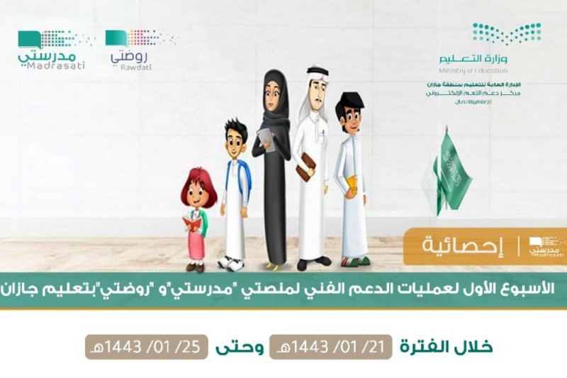 أنهت الإدارة العامة للتعليم بمنطقة جازان، ممثلة بمركز دعم التعلم الإلكتروني، معالجة 14850 عملية دعم فني لمنصتي “مدرستي” و”روضتي”، خلال الأسبوع الأول، لبدء العام الدراسي الجديد 1443هـ.