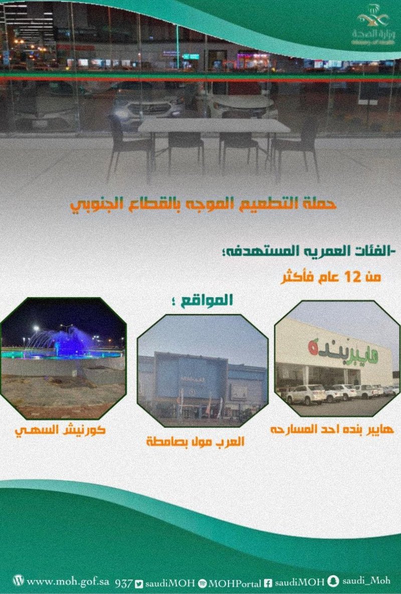 أعلن القطاع الجنوبي بصحة جازان، هذا المساء، عن انطلاق حملة التطعيم الموجّه من كورونا، في المجمعات التجارية والأسواق والمتنزهات، من خلال فرق ميدانية ثابتة في كل من هايبر بندة بأحد المسارحة والعرب مول بصامطة وكورنيش السهي.