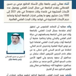 أشاد رئيس جامعة جازان الأستاذ الدكتور مرعي بن حسين القحطاني، بتقدم الجامعة في مجال البحث العلمي، ووصول عدد الأبحاث المنشورة في قاعدة بيانات Scopus في عام 2021 إلى 1000 بحث، وهو ما يعكس قدرات الجامعة البحثية، وتصاعد حجم الأبحاث المنشورة في قواعد بيانات البحث العلمي العالمية.