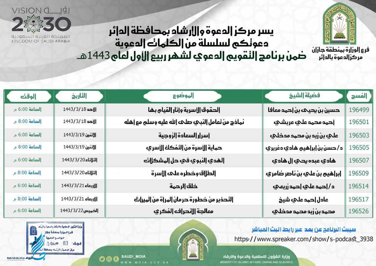 تنظم وزارة الشؤون الإسلامية والدعوة والإرشاد ممثلة بفرعها في منطقة جازان سلسلة من الكلمات الدعوية ضمن برنامج التقويم الدعوي لشهر ربيع الأول 1443 والتي ستنطلق مساء غد الأحد الثامن عشر من شهر ربيع الأول 1443 هجرية ويشارك فيه عدد من دعاة الفرع الرسميين والمتعاونين يتحدثون عن الحقوق الأسرية وأثار القيام بها , ونماذج من تعامل النبي صلى الله عليه وسلم مع أهله وكذلك أسرار السعادة الأسرية وحماية الأسرة من التفكك الأسري ومعالجة الانحراف الفكري وغيرها من المواضيع المهمة .