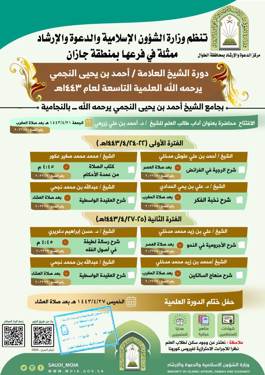 تنظم وزارة الشؤون الإسلامية والدعوة والإرشاد ممثلة بفرعها في منطقة جازان “مركز دعوة الطوال ” دورة الشيخ العلامة أحمد بن يحيى النجمي – يرحمه الله – العلمية التاسعة لعام 1443 للهجرة تنطلق مساء الجمعة الموافق 21 / 4 / 1443 هـ , وتأتي محاضرة الافتتاح بعنوان ” آداب طالب العلم الشرعي ” وتُستكمل بعدها بقية محاضرات الدورة حيث تُقام على فترتين خلال أيام الاسبوع ؛