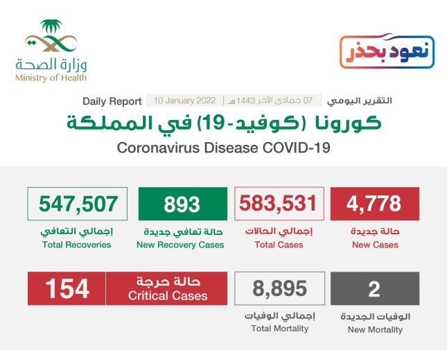 أعلنت وزارة الصحة اليوم الإثنين (10 يناير 2022) عن تسجيل (4778) حالة إصابة جديدة بفيروس كورونا (كوفيد-19)، ليصبح الإجمالي 583531 حالة إصابة.