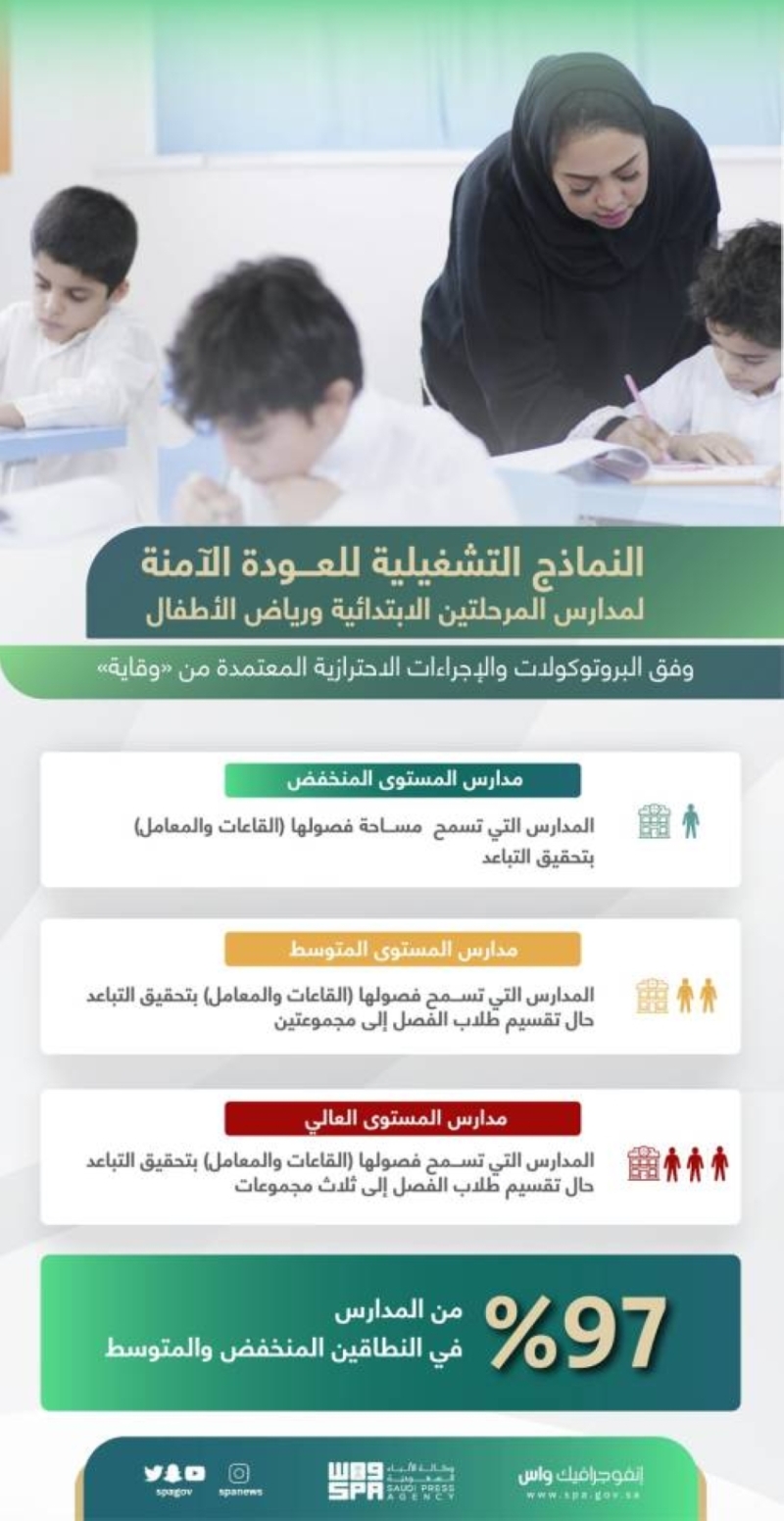 اعتمدت وزارة التعليم ثلاثة نماذج تشغيلية (منخفض، ومتوسط، وعالٍ), لعودة الدراسة في المرحلتين الابتدائية ورياض الأطفال الحكومية والأهلية والعالمية والأجنبية, بدءًا من يوم الأحد 23 يناير الجاري، حيث تقع 97% من إجمالي المدارس ضمن نطاق المستويين المنخفض والمتوسط.