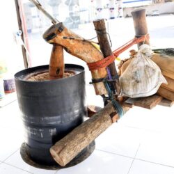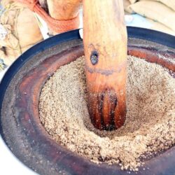 وبعد وضع بذور السمسم في المعصرة تضاف كميات مناسبة من الماء إلى البذور وتحرك البذور داخل المعصرة بواسطة “القطب” وسط المعصرة بحركة دائرية عن طريق جمل يواصل العمل لساعات طويلة في اليوم في حركة دائرة دائبة وهو مغمض العينين حتى لا يصاب بالدوار.