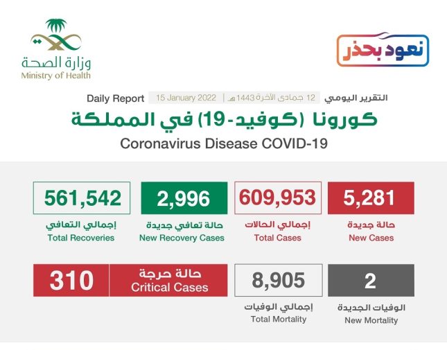 وبينت الإحصائية أن إجمالي عدد الإصابات في المملكة بلغ (609953) فيما وصل عدد حالات التعافي إلى (561542), كما جرى تسجيل حالتي وفاة ليصل إجمالي الوفيات في المملكة إلى (8905) “رحمهم الله”.