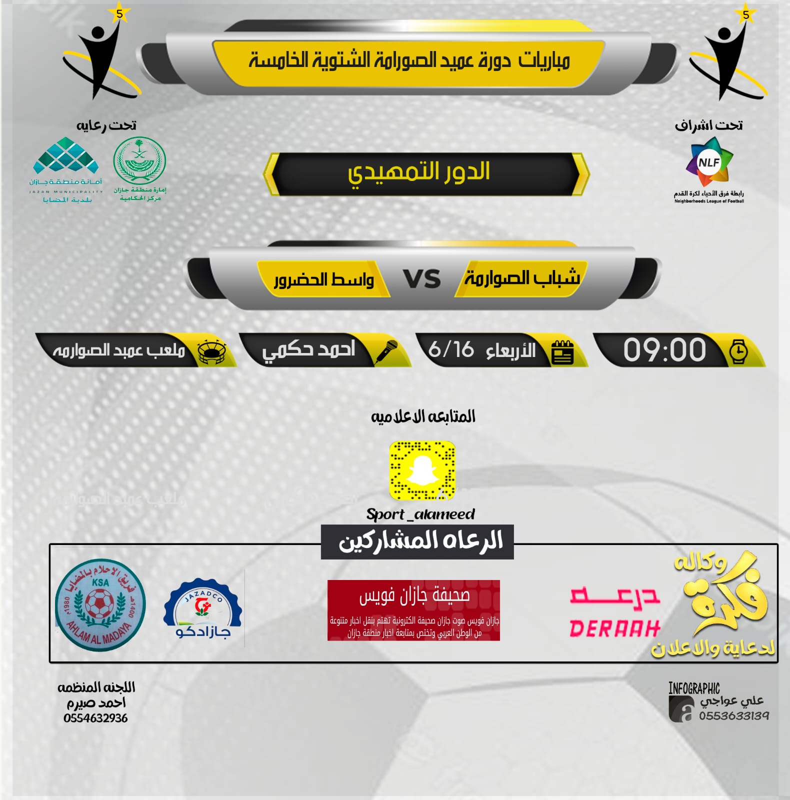 في لقاء وحيد اليوم الاربعاء الموافق 16/6/1443 هـ على ملعب عميد الصوارمة وتعليق المتالق احمد حكمي