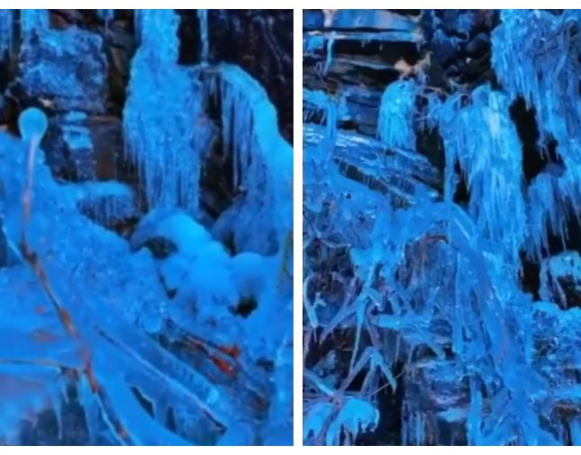 وأظهر مقطع الفيديو الذي نشرته العربية عبر صفحتها بموقع “تويتر”، منظر مدهش لشلال المياه الذي بدى كلوحة طبيعية مصنوعة من الزجاج بسبب تجمد المياه.
