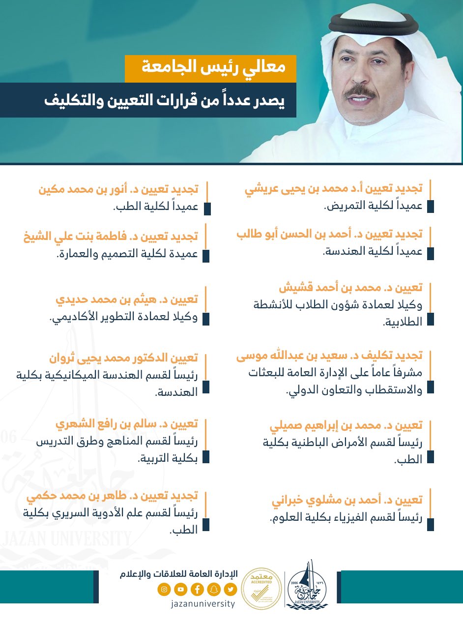 ‏معالي رئيس جامعة جازان يصدر عدداً من قرارات التعيين والتكليف