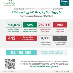 وقالت الوزارة إنه تم تسجيل 525 حالة تعافٍ جديدة ليصبح الإجمالي 726876 حالة ولله الحمد.