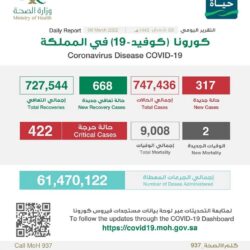 وقالت الوزارة إنه تم تسجيل 668 حالة تعافٍ جديدة ليصبح الإجمالي 727,544 حالة ولله الحمد.