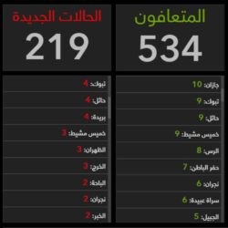 وتم تسجيل 219 إصابة جديدة بفيروس كورونا، و 534 حالة تعافي و 2 حالة وفاة ، و 383 حالة حرجة. فيما بلغ إجمالي حالات المصابين في المملكة