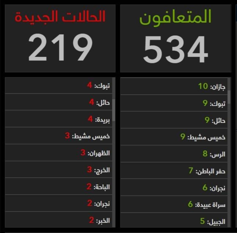 أما أعلى المدن تسجيلا لحالات التعافي فجاءت كما يلي: الرياض (147)، جدة (62)، الدمام (23)، الطائف (21)، المدينة (20)، مكة (18).
