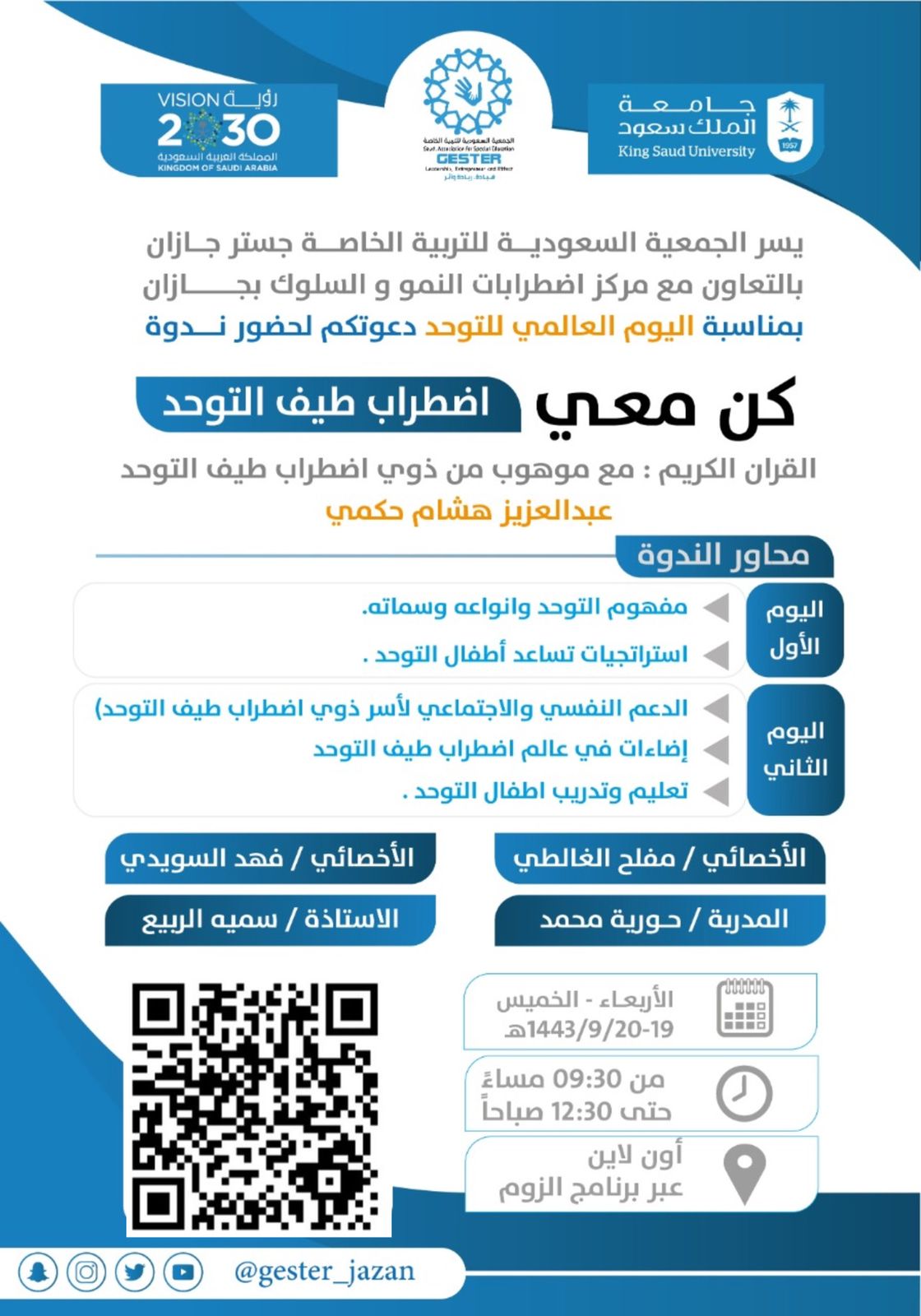 حيث تطرقوا في الندوة لعدة محاور مفهوم التوحد وأنواعه وسماته واستراتجيات أطفال التوحد والدعم النفسي والإجتماعي لأسر ذوي اضطراب طيف التوحد وإضاءات في عالم طيف التوحد وتعليم وتدريب اطفال التوحد .