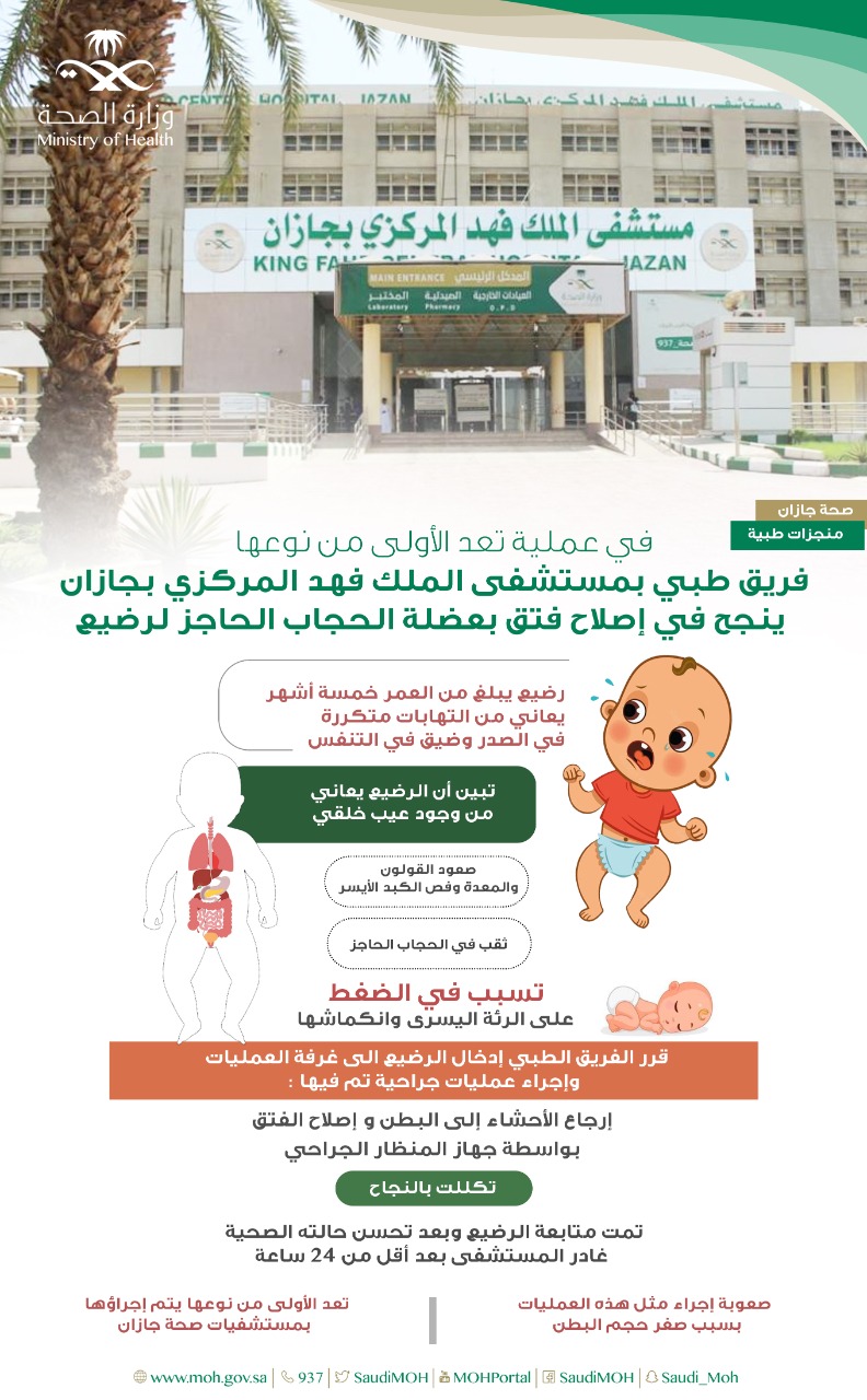 و شرحت صحة جازان حالته وذلك بأن مستشفى الملك فهد المركزي بجازان استقبل رضيع يبلغ من العمر خمسة أشهر يعاني من التهابات متكررة في الصدر وضيق في التنفس، وبعد إجراء الكشف الطبي عليه من قبل أطباء جراحة الأطفال تبين أن الرضيع يعاني من وجود عيب خلقي تتمثل في صعود القولون والمعدة وفص الكبد الأيسر وثقب في الحجاب الحاجز الذي تسبب في الضغط على الرئة اليسرى وانكماشها؛ بناء على ذلك قرر الفريق الطبي إدخال الرضيع إلى غرفة العمليات وإجراء عمليات جراحية تم فيها إرجاع الأحشاء إلى البطن وإصلاح الفتق بواسطة جهاز المنظار الجراحي ومن خلال ثلاث فتحات فقط لا تتجاوز الـ 5 ملم، تكللت بالنجاح ولله الحمد•