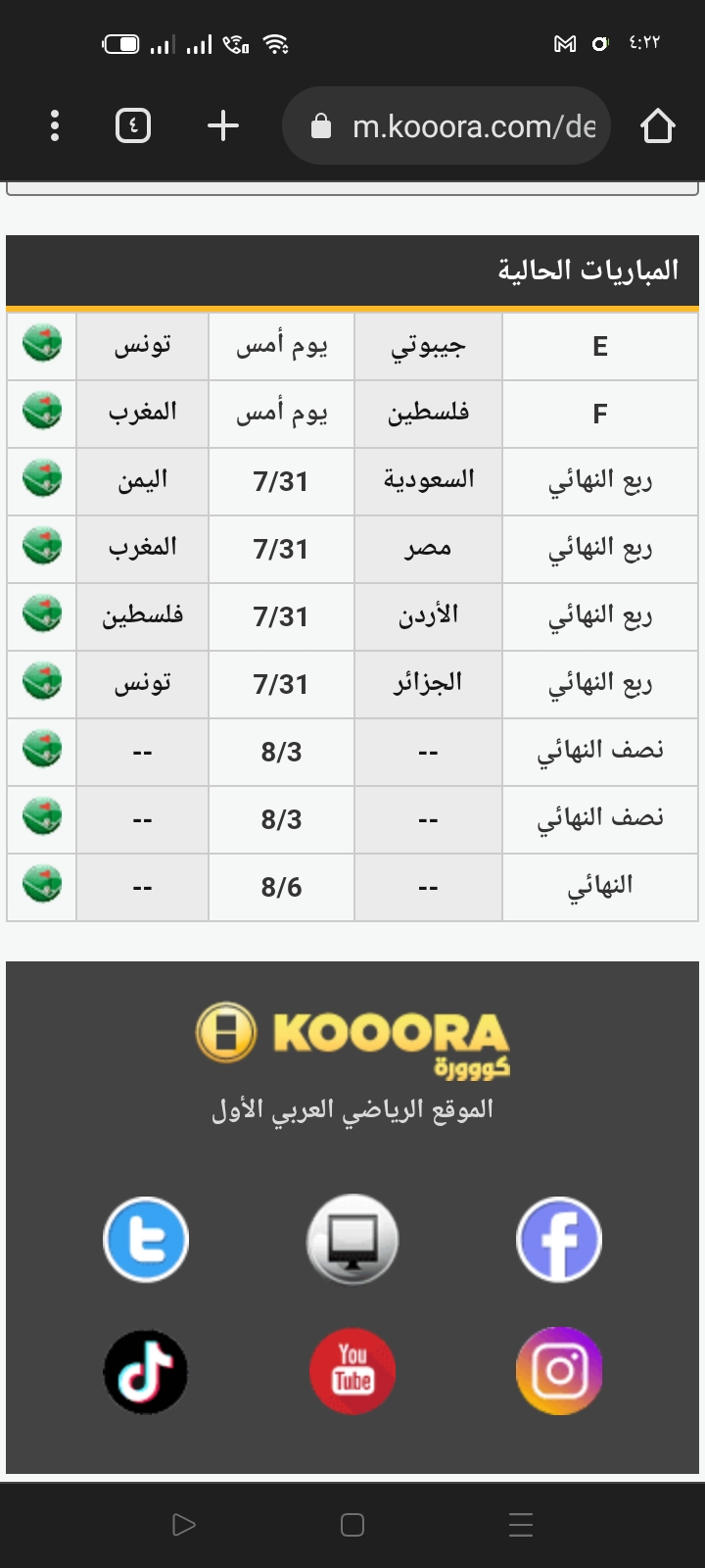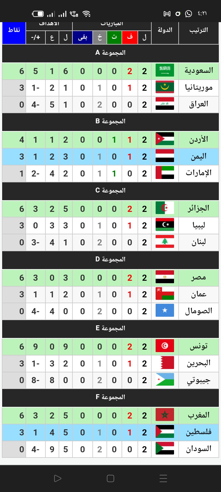 وتأهل المنتخب السعودي عن المجموعة الأولى، مع منتخبي الأردن واليمن من الثانية، ومنتخب الجزائر من الثالثة والمنتخب المصري من الرابعة، والمنتخب التونسي من المجموعة الخامسة، رفقة منتخبي المغرب وفلسطين من المجموعة السادسة والأخيرة.وتقام مباريات الدور ربع النهائي على مدار يوم الأحد المقبل.