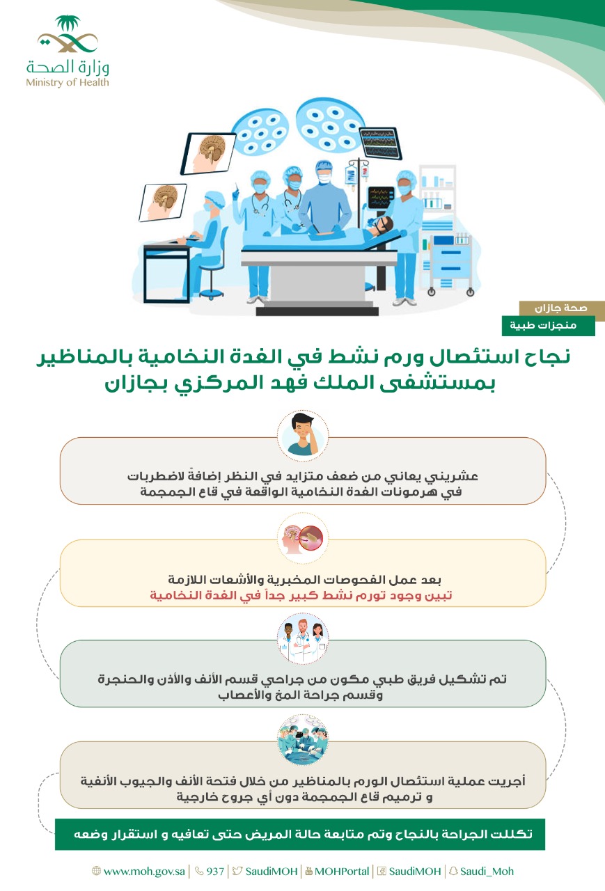 وبعد عمل الفحوصات المخبرية والأشعات اللازمة تبين وجود تورم نشط كبير جداً في الغدة النخامية الأمر الذي أدى لتشكيل فريق طبي مكون من جراحي قسم الأنف والأذن و الحنجرة وقسم جراحة المخ والأعصاب لإجراء التحضير اللازم للحالة، حيث تم بعدها إجراء عملية استئصال الورم بالمناظير من خلال فتحة الأنف والجيوب الأنفية و ترميم قاع الجمجمة دون أي جروح خارجية وتكللت ولله الحمد بالنجاح.