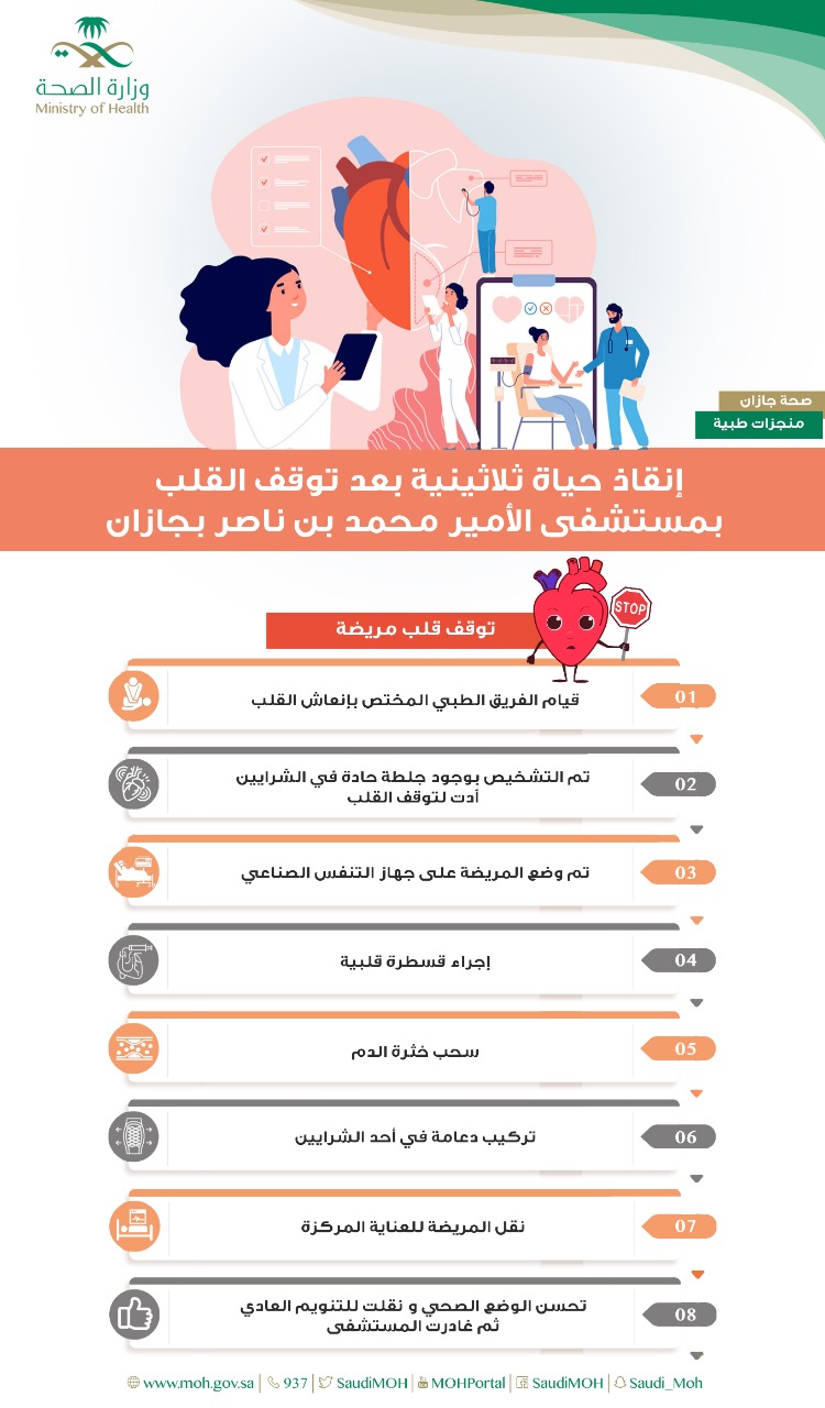 قالت صحة جازان أن فريقاً طبياً بمستشفى الأمير محمد بن ناصر تمكن من إنقاذ حياة مريضة ثلاثينية بعد توقف قلبها.