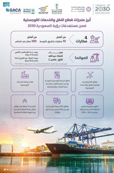وشهد العام الماضي تحسنا كبيراً في ترتيب المطارات السعودية عالمياً؛ حيث تم تصنيف 4 مطارات سعودية ضمن أفضل 10 مطارات بالشرق الأوسط تحسناً؛ كما حققت موانئ المملكة إنجازاً فريداً من خلال تصدر ميناء الملك عبدالله لموانئ العالم في مؤشر أداء الحاويات؛ كما حل ميناء جدة الإسلامي في المركز الثامن عالمياً.