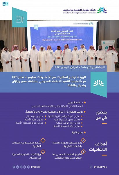 يٌذكر أن الهيئة، ممثلة بمركز “تميز”، وقعت خلال الفترة الماضية اتفاقيات لتنفيذ الاعتماد المدرسي مع (69) شركة تعليمية تضم (1028) مدرسة، و(210,832) ألف طالب وطالبة، ويعد المركز أحد المراكز التابعة لهيئة تقويم التعليم والتدريب، الذي يسعى لمتابعة مستوى تقدم مخرجات التعليم، وتحسن أساليب التقويم، وتحسن البيئة التعليمية المحفزة للإبداع والابتكار، والإسهام في ضمان جودة التعليم المدرسي لتلبية متطلبات التنمية وتحقيق المستهدفات الوطنية.