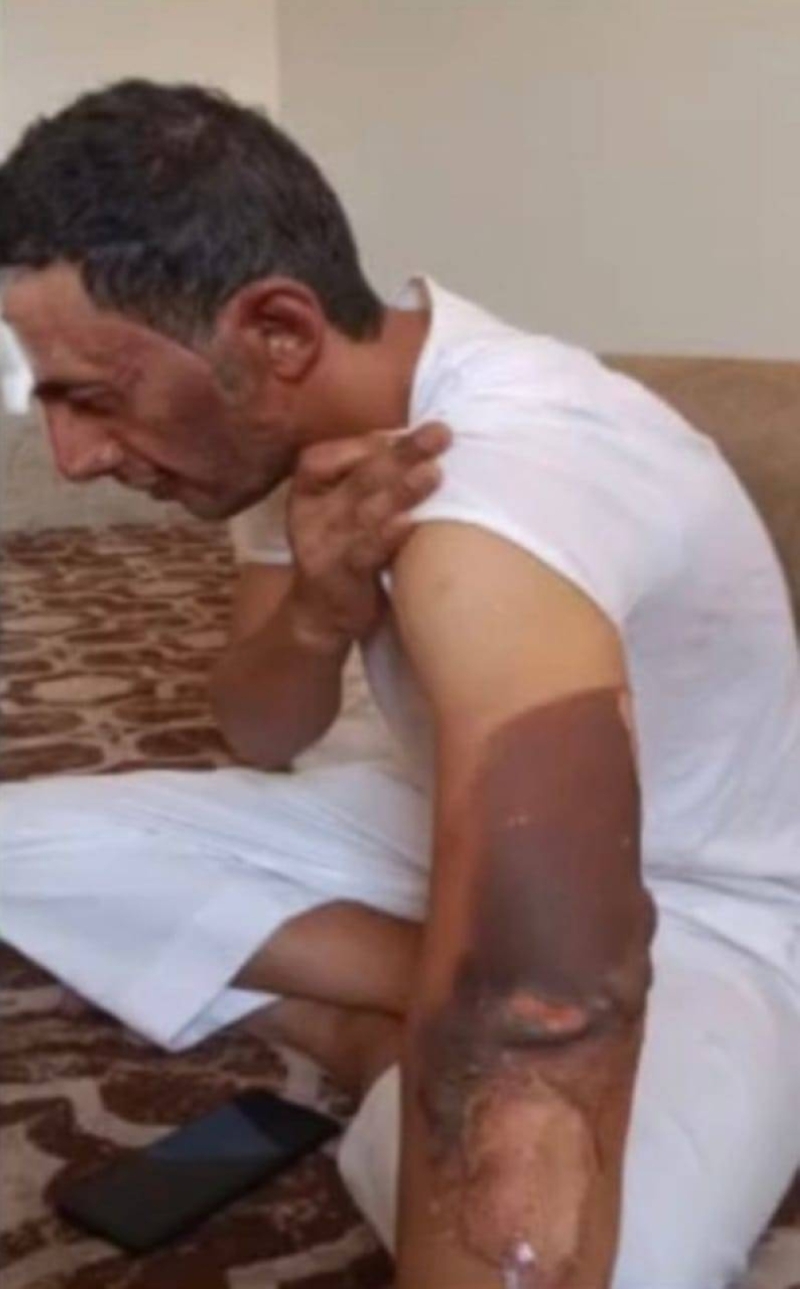 ووثقت صورة ظهور المواطن مصابا بحروق في الذراع والوجه، حيث طالته النيران أثناء محاولته إنقاذ الطفل.