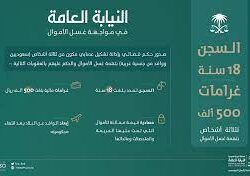 وقد تم إيقاف المتهمين، والادعاء عليهم أمام المحكمة المختصة، وتقديم الأدلة على اتهامهم، وصدر الحكم القضائي المتضمن إدانتهم بما نُسب إليهم، وأن الكيانات التجارية غطاء لتحويل الأموال مجهولة المصدر إلى خارج المملكة، والحكم عليهم بالسجن لمدد بلغت (18) سنة، وغرامات مالية بلغت (500.000) ريال، ومصادرة قيمة مماثلة للأموال التي تمت عليها الجريمة والمتحصلات منها وعائداتها، وإبعاد الوافد عن البلاد بعد انتهاء محكوميته.