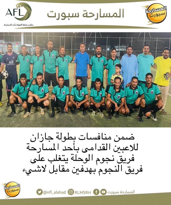 ضمن منافسات بطولة جازان للاعبين القدامى بأحد المسارحة فريق نجوم الوحلة يتغلب على فريق النجوم بهدفين مقابل لاشيء