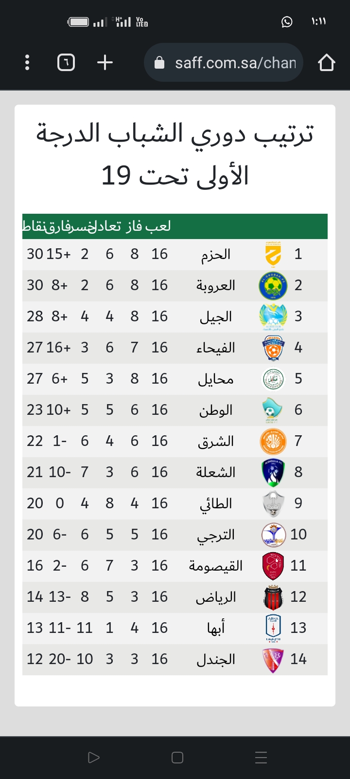 ضمن الجولة 16 من دوري الدرجة الأولى شباب تحت 19 سنة أقيمت بمدينة الرس مواجهة جمعت بين شباب الوطن من ضمد بمنطقة جازان والحزم من الرس وانتهت بفوز الحزم بنتيجة 1/0 وبذلك رفع الحزم رصيده إلى 30 في صدارة المجموعة متساويا مع العروبة صحاب المركز الثاني ويظل الوطن على رصيده 23 نقطة بالمركز 6 على موعد السبت القادم مع الشعلة ضمن الجولة 17 على ملعب إدارة التعليم بجازان والتي أن فاز بها تكون انطلاقة للعودة للمنافسة على المراكز المتقدمة من المجموعة خاصة وأن دوري الدرجة الأولى شباب تحت 19 سنة تزداد قوة المنافسة فيه بين أكثر من فريق وفرص التأهل من خلاله لدرجة الممتاز تكاد تكون متاحة للجميع