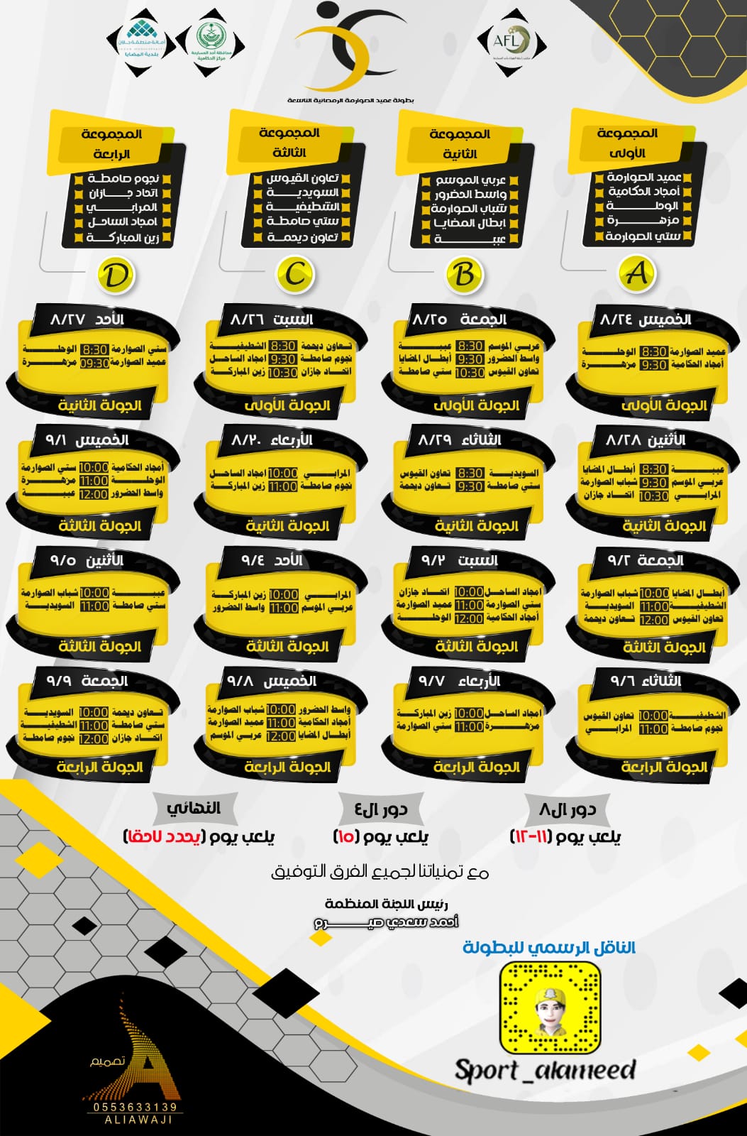 أصدرت اللجنة المنظمة لبطولة دورة عميد الصوارمة الرمضانية جدول مباريات دورة العميد لسنة التاسعة جدول المباريات والتي سوف تقام على ملعب عميد الصوارمة بقرية الصوارمة أحدى قري الساحل وقد حقق أبناء الساحل عموما وابناء قرية الصوارمة نجاحات خلال السنوات الماضية وسوف يكون لنا تغطية افتتاح البطولة وحفل الختام أن شاء الله