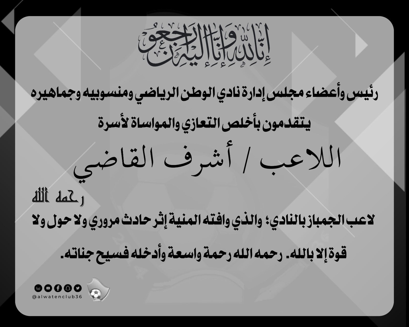 قدمت إدارة نادي الوطن احر التعازي والمواساة لأسرة الفقيد اشرف القاضي لاعب الجمباز وذلك عبر موقع النادي الرسمي على تويتر