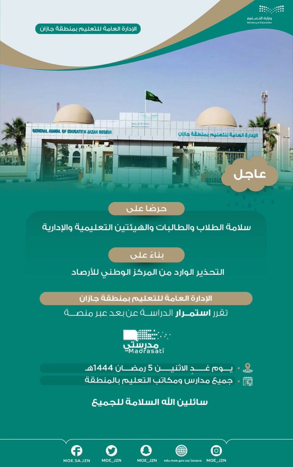 وأفادت الإدارتان بأن العملية الدراسية ستكون مستمرةً عبر منصة “مدرستي” لجميع الطلاب والطالبات ومنسوبي ومنسوبات المدارس ومكاتب التعليم بمنطقة جازان