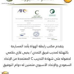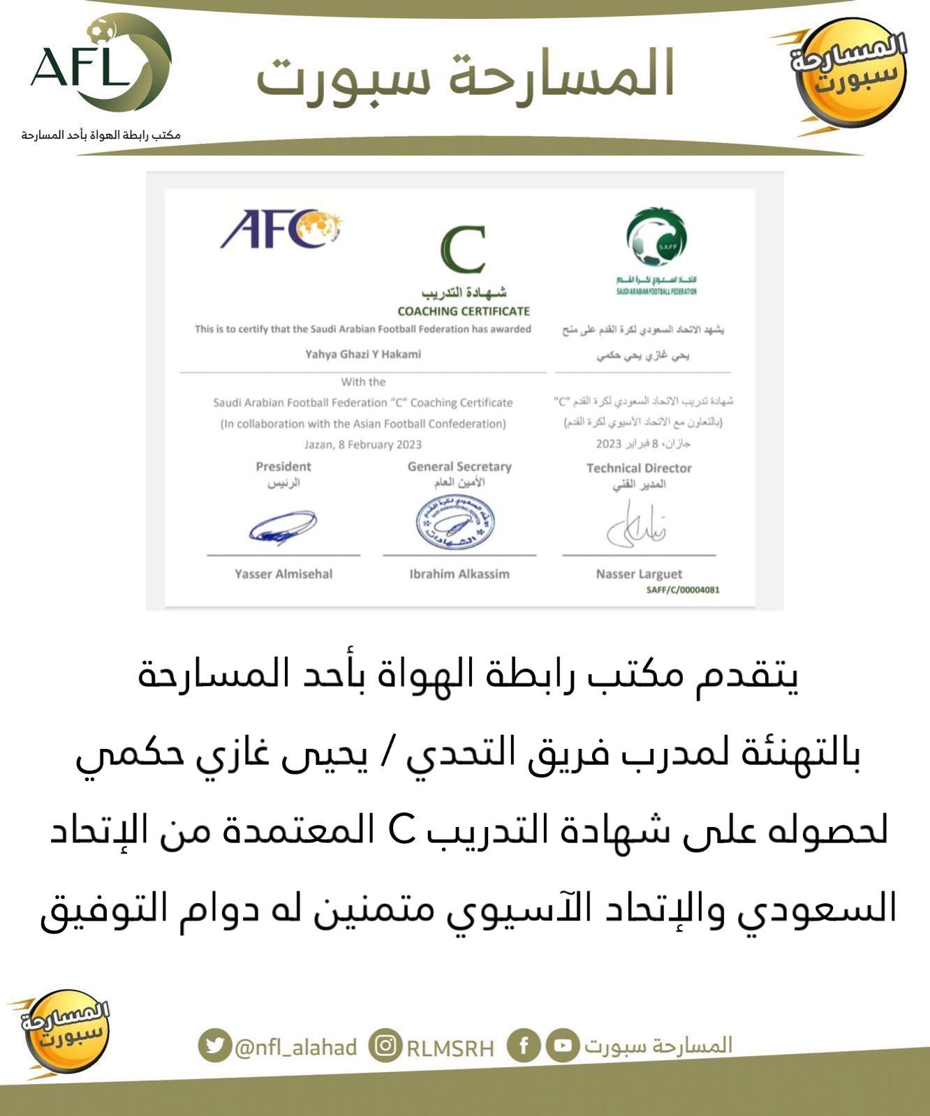 المدرب الوطني يحيى غازي حكمي مدرب فريق التحدي يحصل على شهادة التدريب C المعتمدة من الاتحاد السعودي والاتحاد الآسيوي