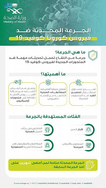 وأوضحت الوزارة توفر الجرعة المحدثة من لقاح كورونا كوفيد 19 للراغبين في الحصول عليها لمن أمضى شهرين فأكثر من تلقى الجرعة السابقة، وذلك من العمر 12 عاماً فأكثر، مشيرة إلى سهولة الحصول على اللقاح من خلال حجز موعد عبر تطبيق “صحتي”، مبينة الفئات المستهدفة للجرعة التنشيطية، وهم كبار السن، ذوي الأمراض المناعية والأمراض المزمنة، والفئات ذات الخطورة العالية، إضافة إلى العاملين في بيئات العمل التي تزيد من فرصة الإصابة في الفيروس أو انتشاره، والأفراد الذين مضى على تلقيهم الجرعة السابقة شهرين فأكثر.