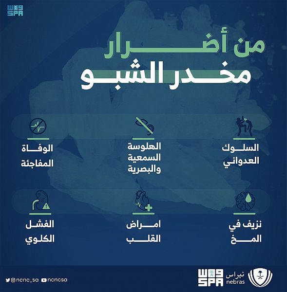 وحذرت اللجنة الوطنية لمكافحة المخدرات “نبراس” من خطر المخدرات عموماً ومخدر الميثامفيتامين – المعروف باسم “الشبو”، الذي يُعد مادَّة منشطة شديدة التأثير على الجهاز العصبي المركزي يتم تحضيرها من الأمفيتامين وهي من المخدرات المصنعة كيميائياً ولها عدد من الأسماء على حسب الموقع الجغرافي، مثل: “الشبو، الميث، الكريستال، سبيد، الثلج”، وتتسبب بزيادة مفاجأة في مستويات الدوبامين في الدماغ؛ مما يغير طريقة تفكير واستيعاب متعاطيها للأحداث من حوله، وهذا الأمر يجعله في حالة من التوجس والقلق والشعور بالتهديد، بالإضافة إلى الهلاوس السمعية والبصرية، مما يجعله في حالة اضطراب نفسي يقوده إلى العنف والتهور في سلوكياته بشكل عام.