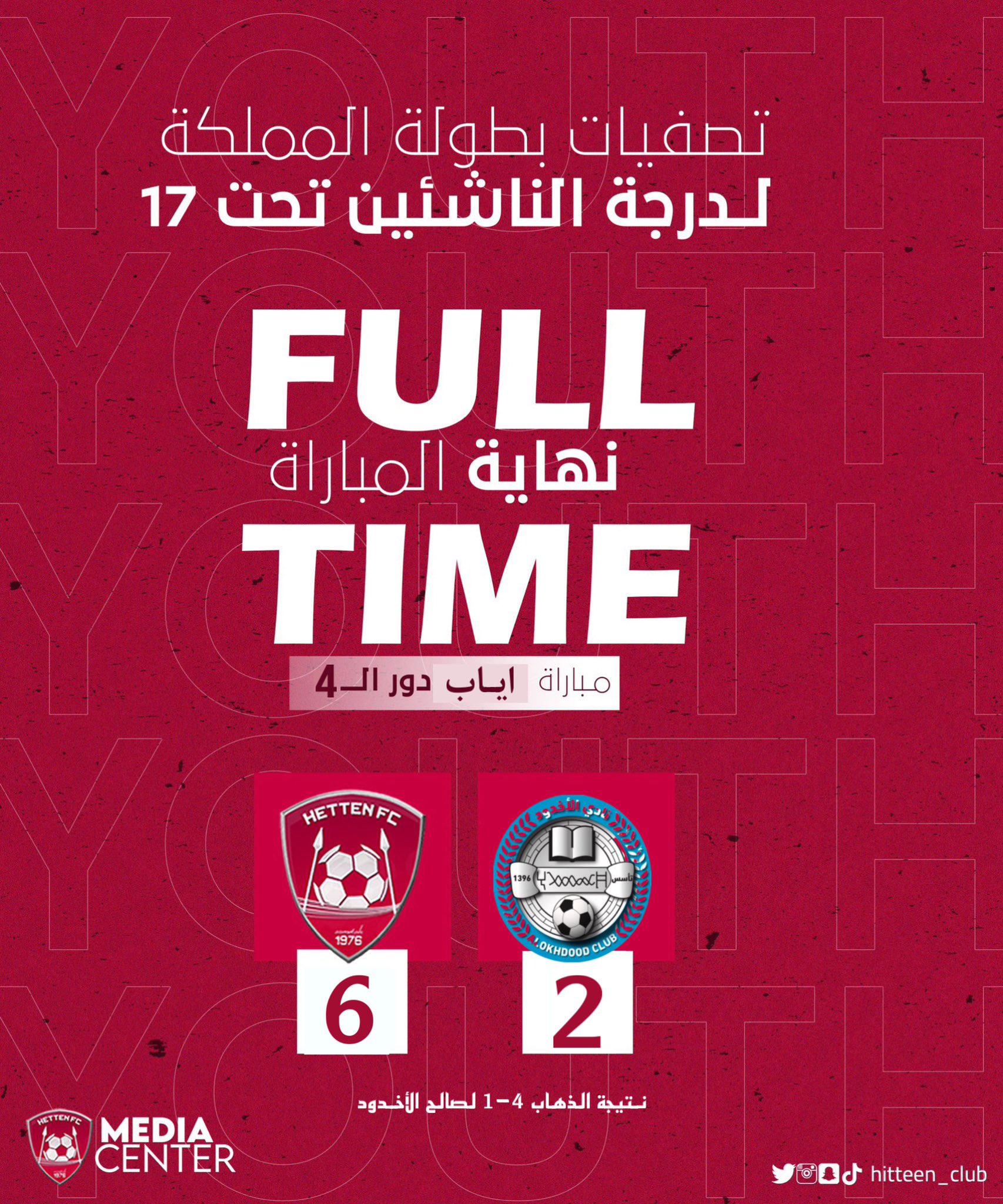 أقيمت اليوم على ملعب التعليم بمنطقة جازان مباراة الإياب بين ناشئين حطين و ناشئين الاخدود انتهت بفوز حطين بنتيجة 2/6 وبهذا صعد حطين إلى الدرجة الأولى