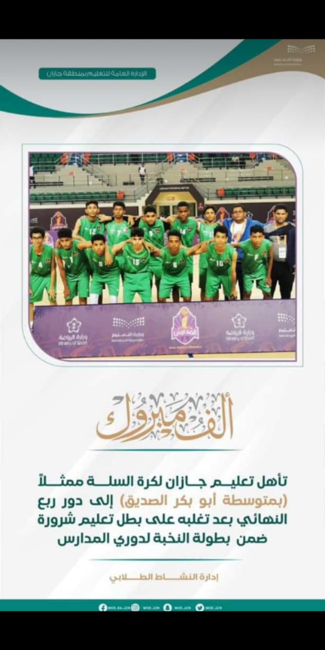 تأهل تعليم جازان لكرة السلة ممثلا بمتوسطة ابو بكر الصديق إلى دور ربع النهائي لكرة السلة بعد تغلبه على بطل تعليم شرورة ضمن بطولة النخبة لدوري المدارس والمقامة بمدينة جدة
