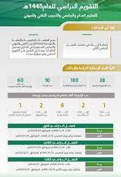 أوضحت وزارة التعليم، أن التقويم الدراسي الجديد للعام 1445ھ للتعليم العام والجامعي والتدريب التقني والمهني، يشتمل على 3 فصول دراسية، و38 أسبوعًا دراسيًّا؛ بواقع 180 يومًا دراسيًّا، و60 يومًا من الإجازات المتنوعة أثناء العام الدراسي، إلى جانب 68 يومًا عدد أيام الإجازة الصيفية كاملة.