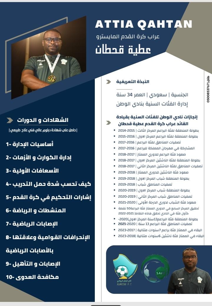 نجم امد لنا نجوم احب المستطيل الاخضر عشق كره القدم نبذه عن شخص عرفه ابناء منطقة جازان عموما وابناء ضمد خصوصا كم نجم قد اكتشف لنا ولهم باذن الله التوفيق في ملاعبنا على اتساع الوطن المملكة العربية السعودية وعلى الملاعب الدولية انه إداري الفئات السنية بنادي الوطن عراب كرة القدم عطية قحطان