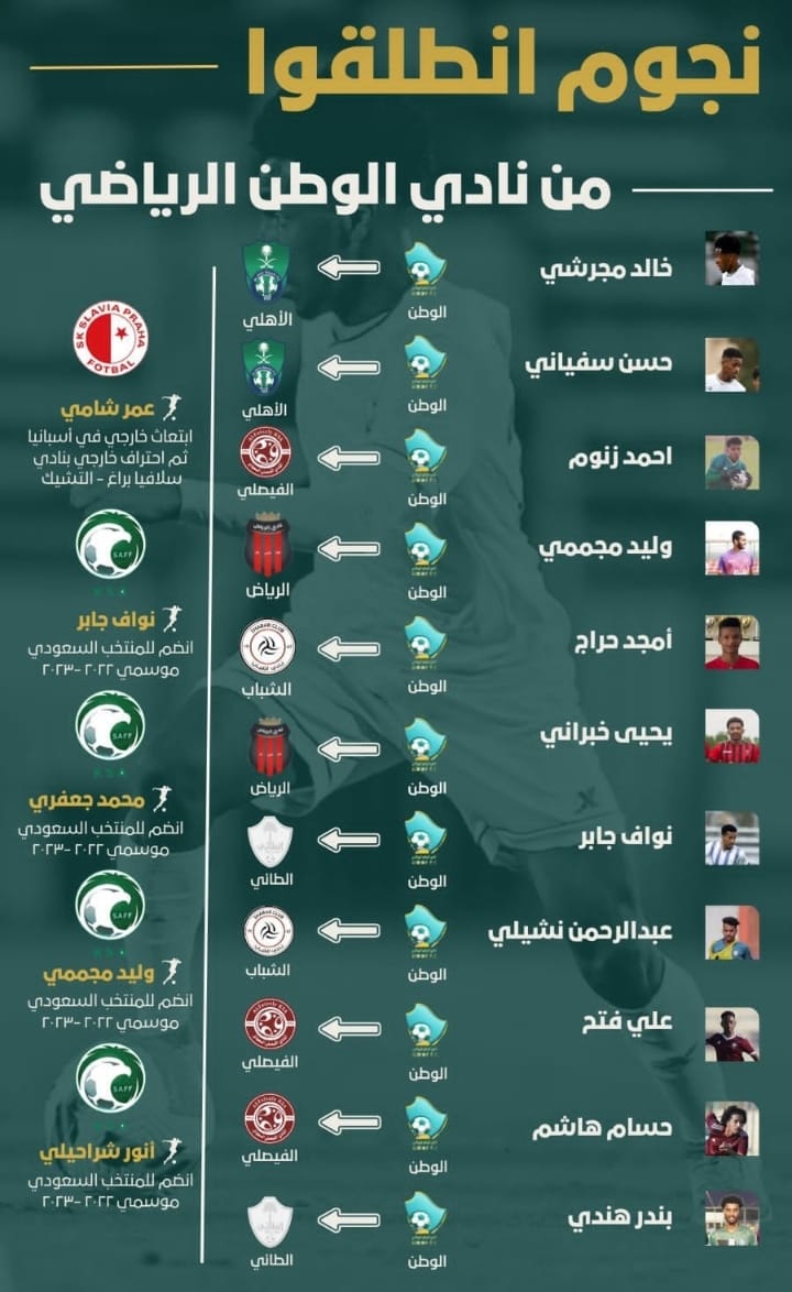 نجوم انطلقوا من نادي الوطن تم اكتشافهم من خلال نادي الوطن بقيادة إداري الفئات السنية بالنادي الوطن عراب كرة القدم عطية قحطان وصنع نجوميتهم وتأسيسهم على يد الكابتن سلطان عواجي