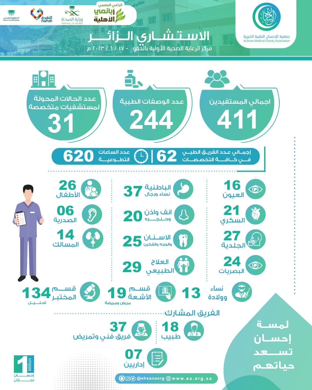 وبيّنت الجمعية أن إجمالي عدد الكوادر الطبية المشاركة في الزيارة بلغ 62 متطوعًا في جميع التخصصات الطبية، فيما تم تأمين الأدوية لـ 244 مستفيداً، مشيرةً إلى أنه تم تحويل 631 حالة لعدد من المستشفيات المركزية بجازان.