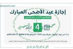 أعلنت وزارة الموارد البشرية اليوم، أن إجازة عيد الأضحى للقطاعين الخاص وغير الربحي ستكون ٤ أيام.