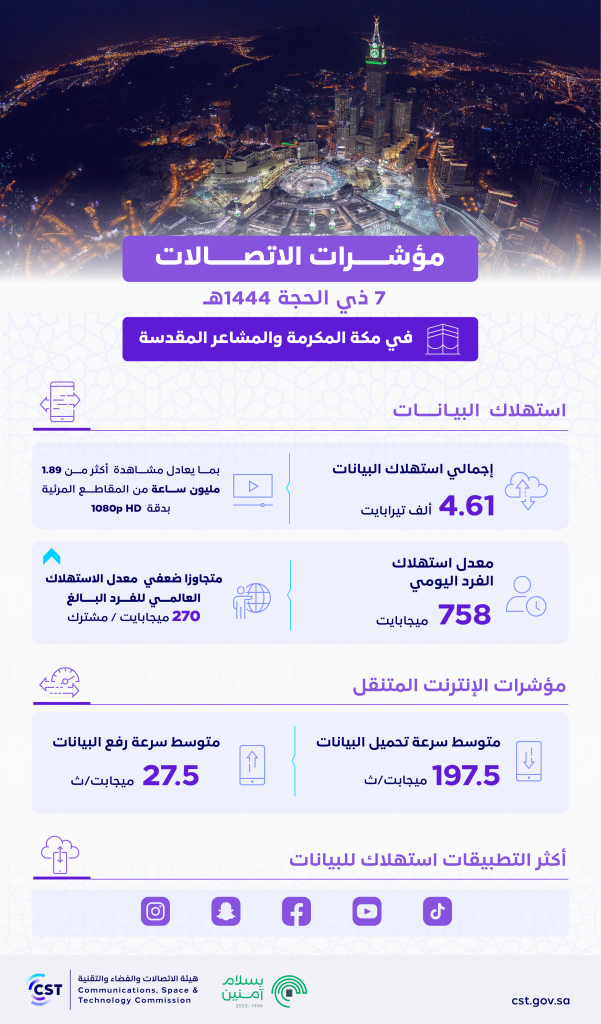“هيئة الاتصالات”: حجم استهلاك البيانات يرتفع إلى 4.61 آلاف تيرابايت في مكة والمشاعر خلال سابع أيام ذي الحجة