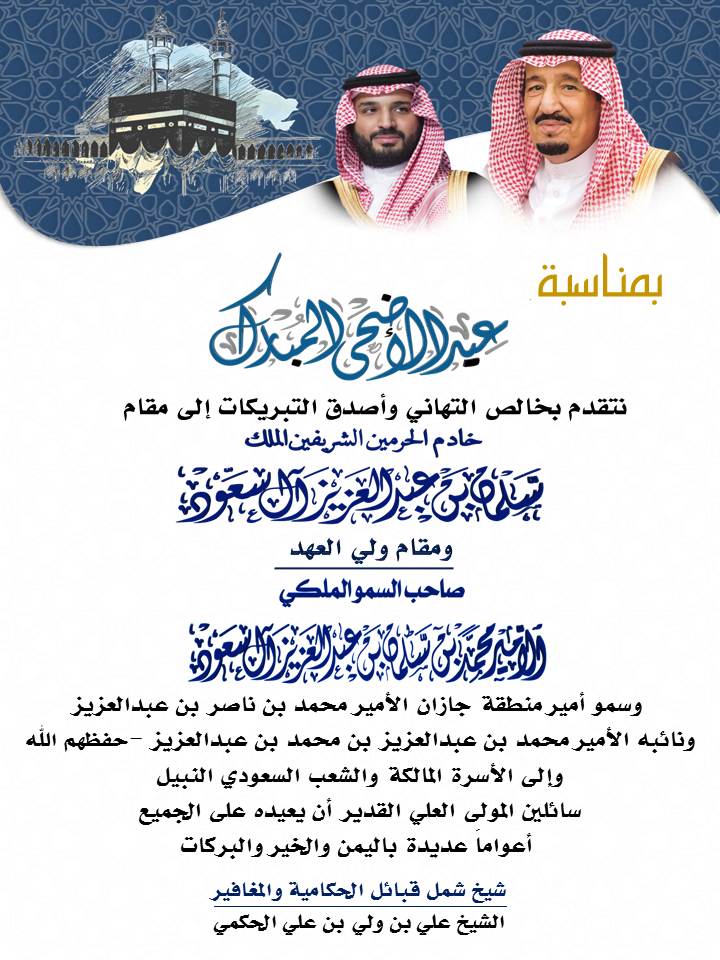 أرفع أسمى آيات التهاني إلى مقام مولاي خادم الحرمين الشريفين وسمو ولي العهد-حفظهما الله-وسمو أمير منطقة جازان وسمو نائبه وللشعب السعودي الكريم بمناسبة حلول عيد الأضحى المبارك.