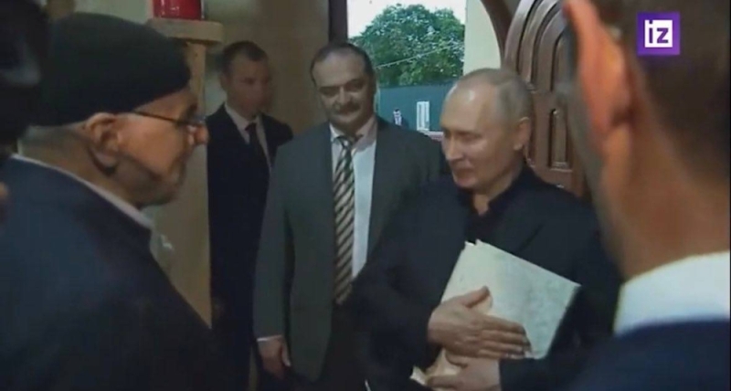 بوتين يحتضن القرآن بعد أن أهدي إليه أثناء زيارته لأحد المساجد في داغستان