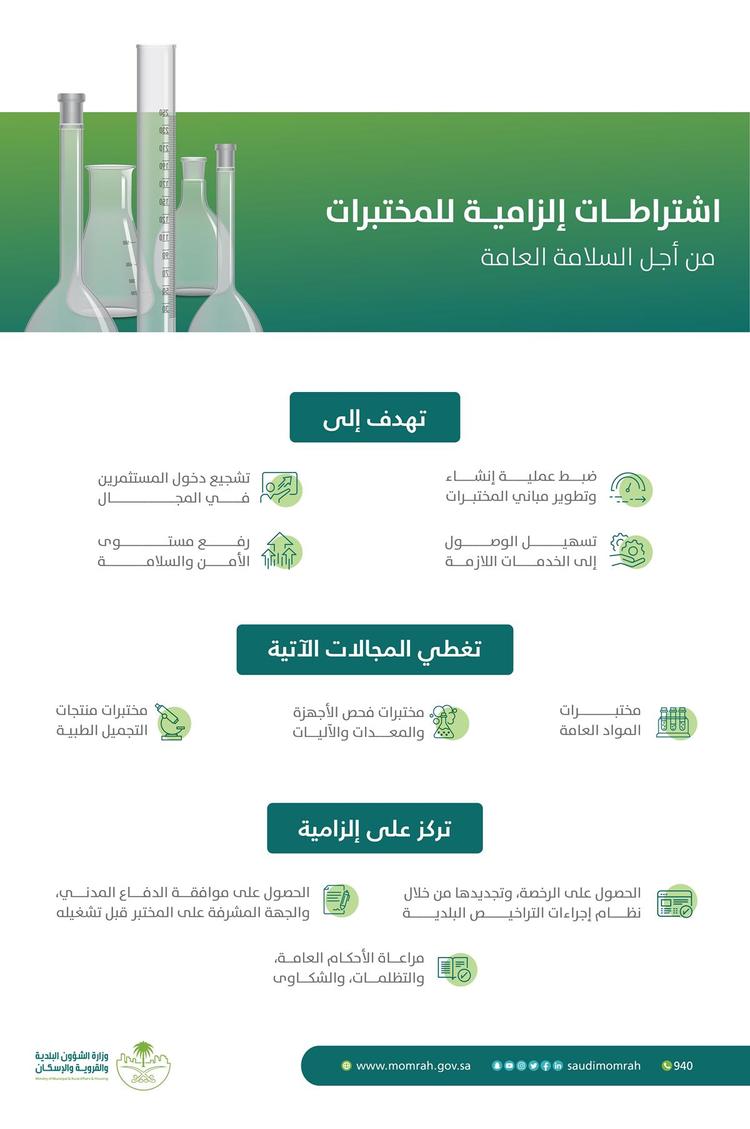 وتركز الاشتراطات على إلزام المستثمرين بالحصول على موافقة المديرية العامة للدفاع المدني والجهة المشرفة على المختبر قبل البدء بتشغيله، ومراعاة الاشتراطات الفنية والمكانية والأحكام العامة المرتبطة بالمختبر ونشاطه، مع الإشارة إلى أن إصدار الرخصة أو تجديدها سيتم من خلال نظام الإجراءات الخاصة بالتراخيص البلدية لدى الوزارة.