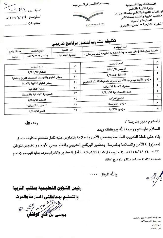 انطلقت اليوم الاربعاء 23/ 6/ 1435هـ بمدرسة المضايا الابتدائية برنامج الدورة التدريبية لمنسقي الامن والسلامة بمدارس قطاع مركز الحكامية التابع لمكتب التربية والتعليم بمحافظتي المسارحة والحرث وهي بمسمى ( كيفية عمل خطة اخلاء عند حدوث الكوارث الطبيعية (نظري وعملي) ) باشرف وتوجيه من الادارة العامة لتربية والتعليم بمنطقة جازان اعداد ومشاركة مكتب التربية والتعليم بمحافظتي المسارحة والحرث تحت اشراف كلا من الاستاذ ابراهيم جابر الحكمي والاستاذ علي محمد دغرير ومدتها يومان تنقاش فيها اوجه السبل للمشاركه الفعلية ووضع خطط الاخلاء عند حدوث الكوارث بشكل نظري وعملي