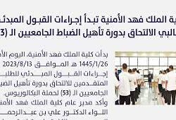 بدأت كلية الملك فهد الأمنية، اليوم الأحد 26/ 1/ 1445 هـ الموافق 13/ 8/ 2023 م، إجراءات القبول المبدئي للطلبة المتقدمين للالتحاق بدورة تأهيل الضباط الجامعيين الـ (53) لحملة البكالوريوس.