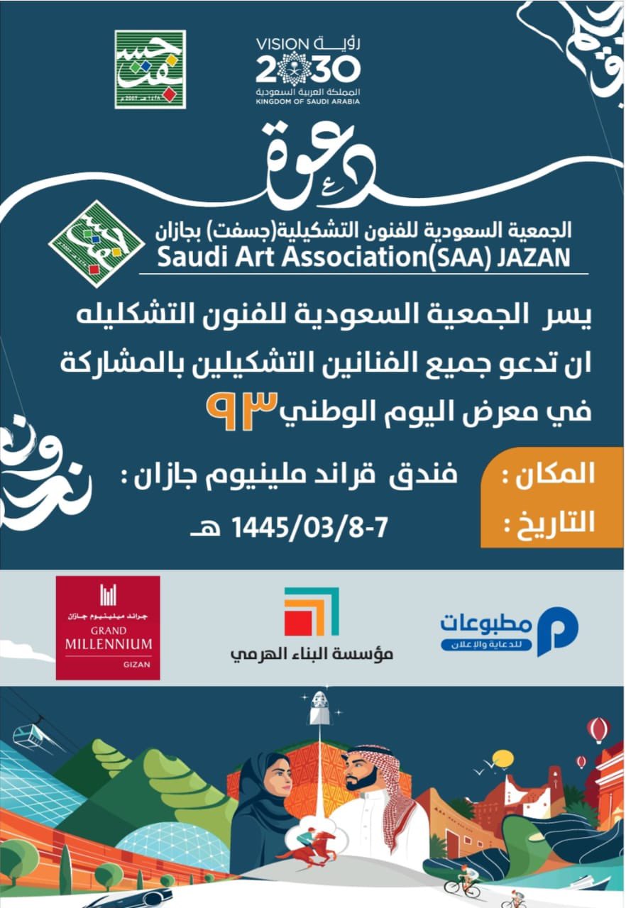 دعت الجمعية السعودية للفنون التشكيلية “جسفت جازان”، الفنانين والفنانات التشكيليين بالمنطقة إلى المشاركة في معرضها الفني، الذي سيقام تزامنًا مع الاحتفاء باليوم الوطني الـ93 للمملكة.